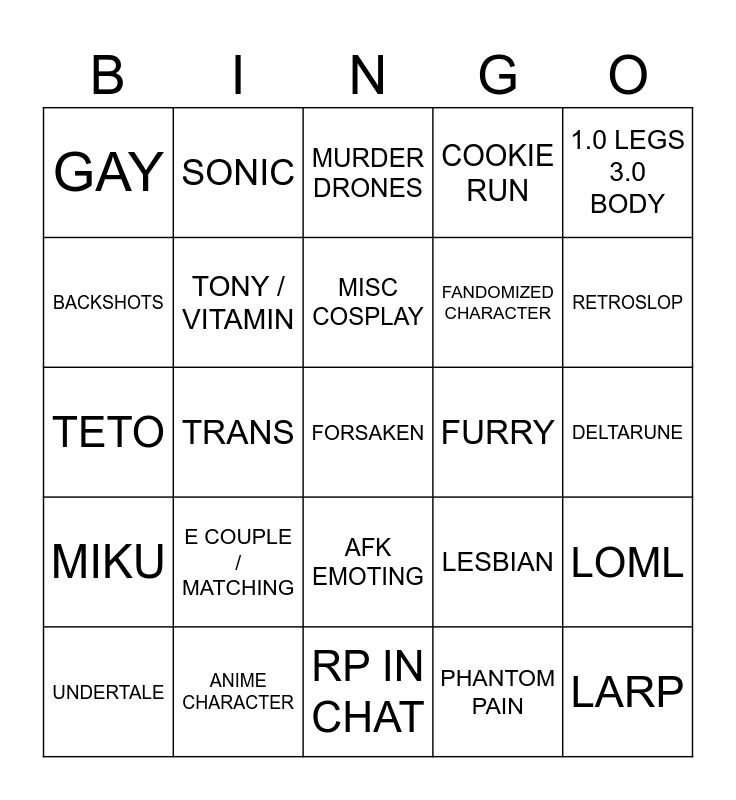 This bingo card has a free space and 24 words: E COUPLE / MATCHING, ANIME CHARACTER, MISC COSPLAY, UNDERTALE, 1.0 LEGS 3.0 BODY, GAY, BACKSHOTS, SONIC, FURRY, AFK EMOTING, FANDOMIZED CHARACTER, TETO, LESBIAN, LOML, TONY / VITAMIN, PHANTOM PAIN, DELTARUNE, MURDER DRONES, RETROSLOP, TRANS, LARP, MIKU, COOKIE RUN and RP IN CHAT.