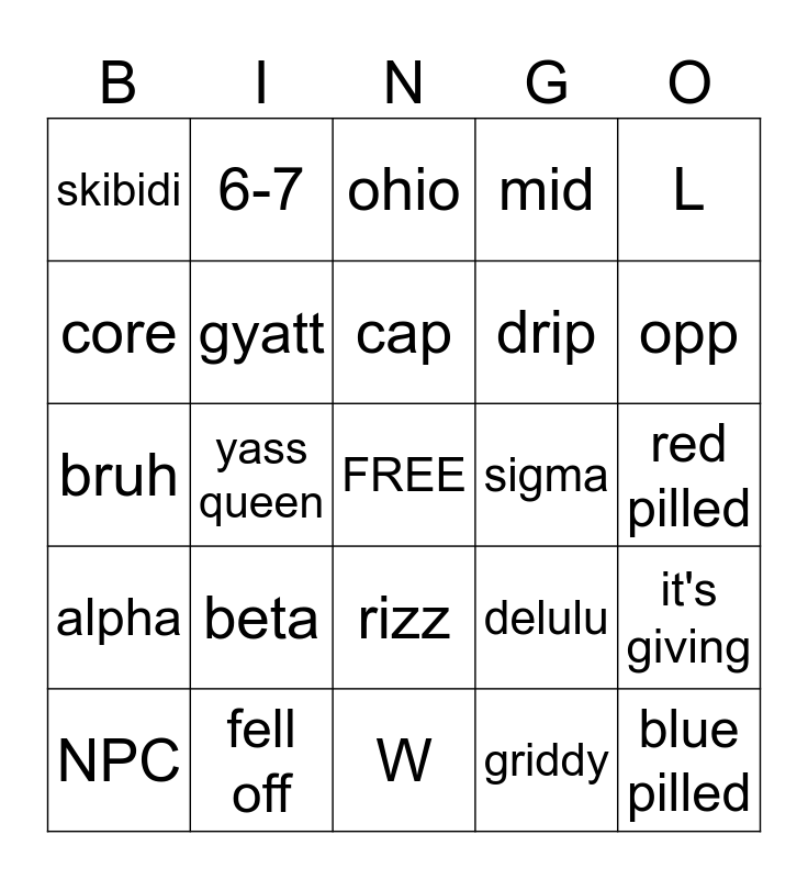 This bingo card has a free space and 30 words: fell off, slay, yass queen, fanum tax, skibidi, ohio, gyatt, rizz, sigma, W, red pilled, blue pilled, griddy, fortnite, opp, rizzler, delulu, alpha, beta, L, bruh, tate (either), 6-7, drip, core, mid, it's giving, NPC, cap and no cap.