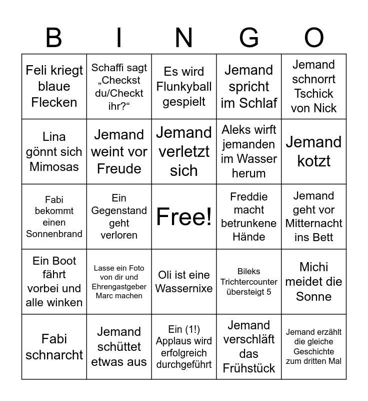 This bingo card has a free space and 24 words: Lasse ein Foto von dir und Ehrengastgeber Marc machen, Jemand schüttet etwas aus, Jemand verletzt sich, Fabi schnarcht, Jemand schnorrt Tschick von Nick, Feli kriegt blaue Flecken, Lina gönnt sich Mimosas, Schaffi sagt „Checkst du/Checkt ihr?“, Freddie macht betrunkene Hände, Oli ist eine Wassernixe, Aleks wirft jemanden im Wasser herum, Fabi bekommt einen Sonnenbrand, Bileks Trichtercounter übersteigt 5, Michi meidet die Sonne, Jemand weint vor Freude, Jemand verschläft das Frühstück, Jemand geht vor Mitternacht ins Bett, Es wird Flunkyball gespielt, Jemand kotzt, Ein Gegenstand geht verloren, Jemand erzählt die gleiche Geschichte zum dritten Mal, Ein Boot fährt vorbei und alle winken, Jemand spricht im Schlaf and Ein (1!) Applaus wird erfolgreich durchgeführt.