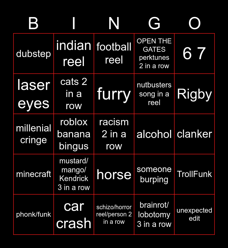 This bingo card has a free space and 24 words: mustard/ mango/ Kendrick 3 in a row, car crash, furry, phonk/funk, 6 7, dubstep, laser eyes, indian reel, alcohol, horse, nutbusters song in a reel, millenial cringe, someone burping, TrollFunk, cats 2 in a row, brainrot/ lobotomy 3 in a row, clanker, football reel, Rigby, roblox banana bingus, unexpected edit, minecraft, OPEN THE GATES perktunes 2 in a row and schizo/horror reel/person 2 in a row.