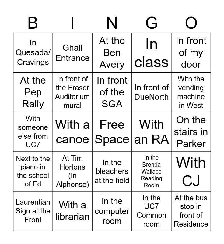 This bingo card has a free space and 29 words: Laurentian Sign at the Front, Pasta Station at GHall, With a canoe, J.N. Desmarais Statue, In Quesada/ Cravings, At the Ben Avery, In front of the Fraser Auditorium mural, At Tim Hortons (In Alphonse), With an RA, With a librarian, On the stairs in Parker, At the bus stop in front of Residence, In the computer room, In the UC7 Common room, With the vending machine in West, In the UC7 kitchen, In the bleachers at the field, Next to the piano in the school of Ed, In front of my door, With someone else from UC7, In the Brenda Wallace Reading Room, At the beach, In front of DueNorth, At the Pep Rally, In class, Ghall Entrance, With CJ, In front of the SGA and In the Games room.