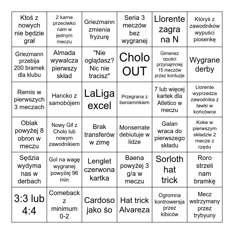 This bingo card has 36 words: Baena powyżej 3 g/a w meczu, Lenglet czerwona kartka, Hat trick Alvareza, Griezmann przebija 200 bramek dla klubu, Oblak powyżej 8 obron w meczu, Przegrana z beniaminkiem, Almada wywalcza pierwszy skład, Cardoso jako śo, Llorente zagra na N, Sorloth hat trick, Wygrane derby, Seria 3 meczów bez wygranej, Roro strzeli nam bramkę, Hancko z samobójem, Cholo OUT, Ktoś z nowych nie będzie grał, Sędzia wydyma nas w derbach, 7 lub więcej kartek dla Atletico w meczu, Remis w pierwszych 3 meczach, Griezmann zmienia fryzurę, LaLiga excel, Nowy Gif z Cholo lub nowym zawodnikiem, Monserrate debiutuje w lidze, Brak transferów w zimę, Galan wraca do pierwszego składu, 2 karne przeciwko nam w jednym meczu, Gimenez opuści przynajmniej 15 meczów przez kontuzje, Comeback z minimum 0-2, "Nie oglądasz? Nic nie tracisz", Któryś z zawodników wypuści piosenkę, Mecz wstrzymany przez trybyuny, 3:3 lub 4:4, Koke w pierwszym składzie 2 mecze z rzędu, Llorente wyprzedza zawodnika z ławki w końcówce, Gol na wagę wygranej powyżej 96 min and Ogromna kontrowersja przez kibiców.