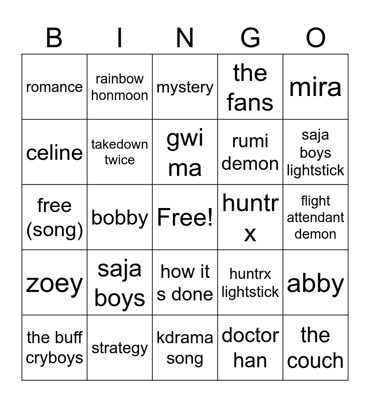 This bingo card has a free space and 40 words: golden, free (song), takedown, takedown twice, strategy, how it s done, gwi ma, rumi, mira, zoey, bobby, the fans, the couch, flight attendant demon, huntr x, saja boys, jinu, romance, baby saja, mystery, abby, doctor han, rumi demon, celine, sunlight sisters, derpy tiger, sussie bird, your idol, soda pop, what it sounds like, the fanboy that changes his shirt, the buff cryboys, saja grandmothers, huntrx lightstick, saja boys lightstick, kdrama song, we are hunters voices strong, the honmoon, rainbow honmoon and broken honmoon.