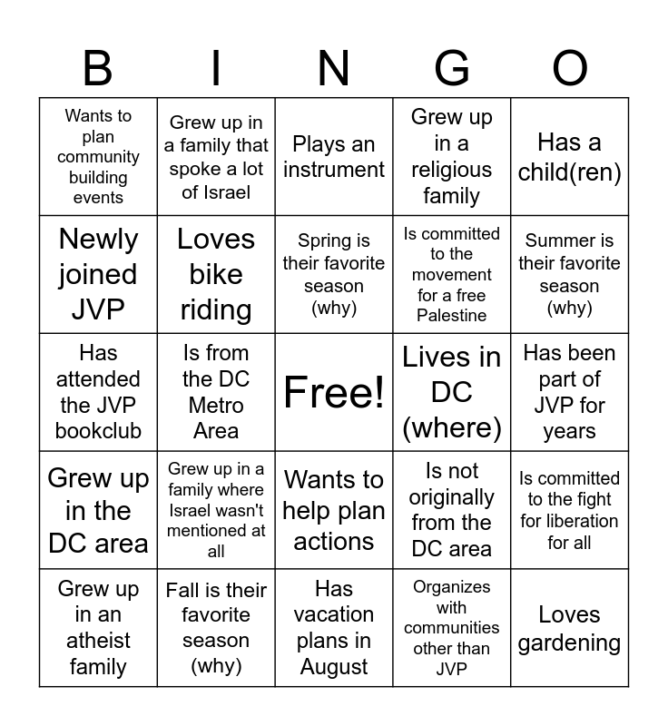 This bingo card has a free space and 29 words: Grew up in an atheist family, Lives in VA (where), Is from the DC Metro Area, Has a pet (what's their name?), Wants to plan community building events, Plays an instrument, Loves bike riding, Grew up in a family where Israel wasn't mentioned at all, Lives in DC (where), Fall is their favorite season (why), Has been part of JVP for years, Loves gardening, Has vacation plans in August, Organizes with communities other than JVP, Summer is their favorite season (why), Lives in MD (where), Wants to help plan actions, Grew up in the DC area, Has a child(ren), Has attended the JVP bookclub, Is not originally from the DC area, Has a creative hobby (what is it), Is committed to the movement for a free Palestine, Newly joined JVP, Grew up in a religious family, Grew up in a family that spoke a lot of Israel, Is committed to the fight for liberation for all, Spring is their favorite season (why) and Winter is their favorite season (why).