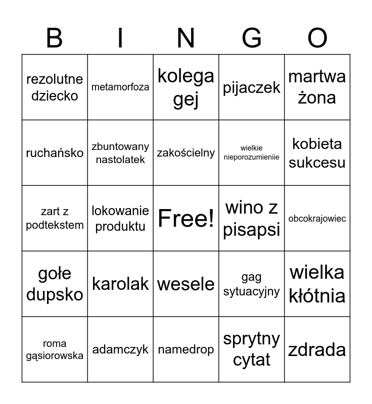 This bingo card has a free space and 24 words: karolak, adamczyk, zakościelny, roma gąsiorowska, martwa żona, rezolutne dziecko, ruchańsko, metamorfoza, wino z pisapsi, wesele, wielkie nieporozumieniie, zart z podtekstem, gag sytuacyjny, wielka kłótnia, zbuntowany nastolatek, sprytny cytat, obcokrajowiec, kolega gej, kobieta sukcesu, lokowanie produktu, zdrada, gołe dupsko, pijaczek and namedrop.
