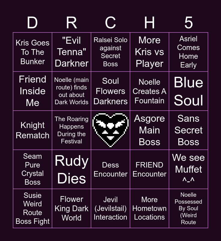 This bingo card has a free space and 24 words: Rudy Dies, Flower King Dark World, Soul Flowers Darkners, Susie Weird Route Boss Fight, Asriel Comes Home Early, Kris Goes To The Bunker, Friend Inside Me, "Evil Tenna" Darkner, Asgore Main Boss, Dess Encounter, Noelle Creates A Fountain, Knight Rematch, FRIEND Encounter, We see Muffet ^-^, Noelle (main route) finds out about Dark Worlds, More Hometown Locations, Sans Secret Boss, Ralsei Solo against Secret Boss, Blue Soul, The Roaring Happens During the Festival, Noelle Possessed By Soul (Weird Route, Seam Pure Crystal Boss, More Kris vs Player and Jevil (Jevilstail) Interaction.