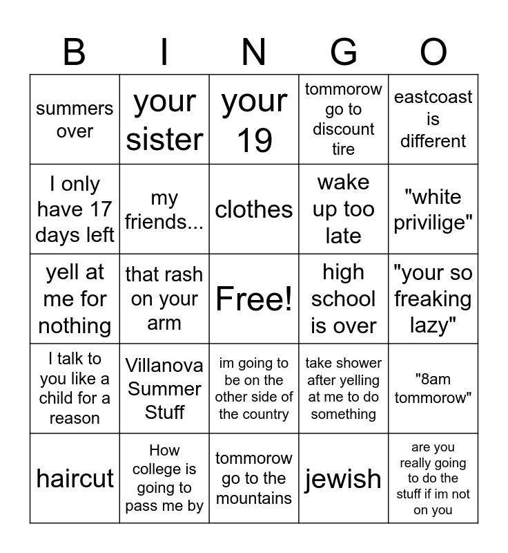 This bingo card has a free space and 24 words: Villanova Summer Stuff, How college is going to pass me by, clothes, haircut, eastcoast is different, summers over, I only have 17 days left, your sister, high school is over, im going to be on the other side of the country, wake up too late, yell at me for nothing, take shower after yelling at me to do something, "8am tommorow", my friends..., jewish, "your so freaking lazy", your 19, "white privilige", that rash on your arm, are you really going to do the stuff if im not on you, I talk to you like a child for a reason, tommorow go to discount tire and tommorow go to the mountains.