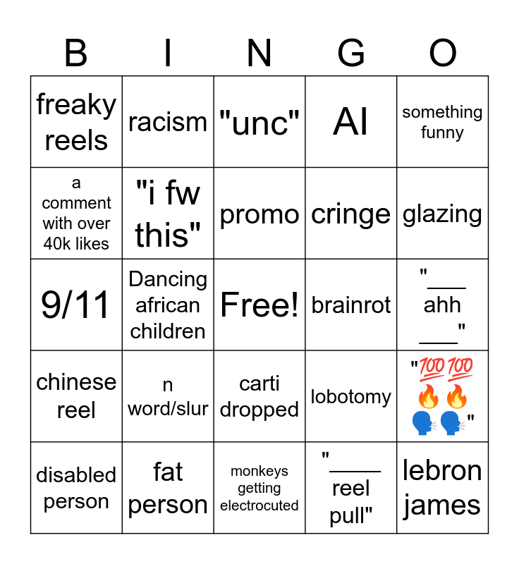 This bingo card has a free space and 24 words: n word/slur, fat person, promo, disabled person, something funny, freaky reels, a comment with over 40k likes, racism, brainrot, carti dropped, cringe, 9/11, lobotomy, "💯💯🔥🔥🗣️🗣️", "i fw this", "____ reel pull", "___ ahh ___", "unc", glazing, Dancing african children, lebron james, chinese reel, AI and monkeys getting electrocuted.