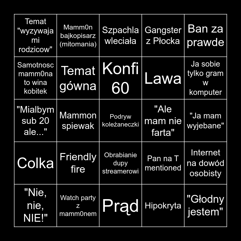 This bingo card has 25 words: Friendly fire, Prąd, Konfi 60, "Nie, nie, NIE!", Ban za prawde, Temat "wyzywaja mi rodzicow", Samotnosc mamm0na to wina kobitek, Mamm0n bajkopisarz (mitomania), "Ale mam nie farta", Obrabianie dupy streamerowi, Lawa, "Mialbym sub 20 ale...", Pan na T mentioned, Internet na dowód osobisty, Temat gówna, "Głodny jestem", "Ja mam wyjebane", Szpachla wleciała, Ja sobie tylko gram w komputer, Mammon spiewak, Podryw koleżaneczki, Watch party z mamm0nem, Colka, Gangster z Płocka and Hipokryta.