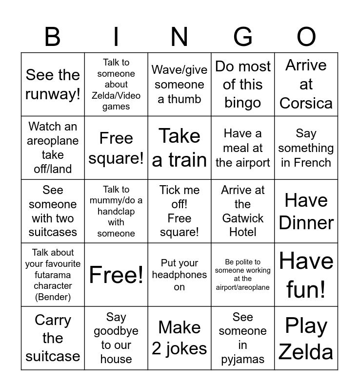 This bingo card has a free space and 24 words: Free!, Say goodbye to our house, Take a train, Carry the suitcase, Arrive at Corsica, See the runway!, Watch an areoplane take off/land, Talk to someone about Zelda/Video games, Arrive at the Gatwick Hotel, Put your headphones on, Have a meal at the airport, See someone with two suitcases, Be polite to someone working at the airport/areoplane, Have fun!, Free square!, See someone in pyjamas, Have Dinner, Wave/give someone a thumb, Say something in French, Talk to mummy/do a handclap with someone, Play Zelda, Talk about your favourite futarama character (Bender), Do most of this bingo and Make 2 jokes.