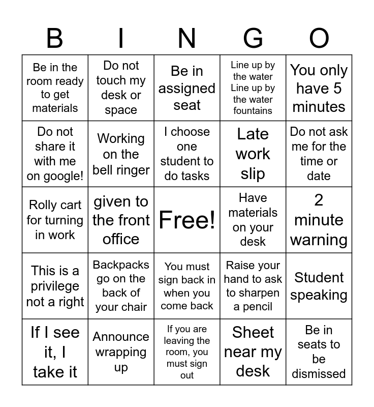 This bingo card has a free space and 29 words: If I see it, I take it, Given back at the end of the day, given to the front office, I do not want to see them at all, Be in the room ready to get materials, Be in assigned seat, Working on the bell ringer, Backpacks go on the back of your chair, Have materials on your desk, Announce wrapping up, 2 minute warning, Be in seats to be dismissed, If you are leaving the room, you must sign out, Sheet near my desk, Do not ask me for the time or date, Write neatly, You must sign back in when you come back, This is a privilege not a right, You only have 5 minutes, Rolly cart for turning in work, Raise your hand to ask to sharpen a pencil, Give me your Chromebook/ Backpack, Late work slip, Do not share it with me on google!, Line up by the water Line up by the water fountains, Do not touch my desk or space, Student speaking, I choose one student to do tasks and Knock once on my door.