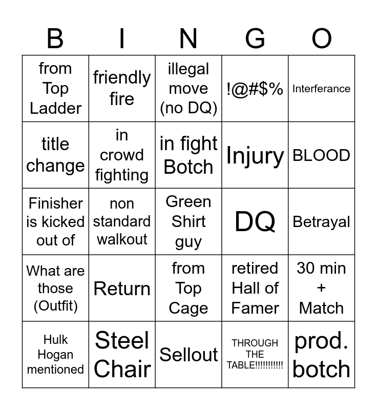 This bingo card has a free space and 24 words: Return, Steel Chair, in fight Botch, Hulk Hogan mentioned, Interferance, from Top Ladder, title change, friendly fire, DQ, from Top Cage, Injury, Finisher is kicked out of, retired Hall of Famer, 30 min + Match, in crowd fighting, THROUGH THE TABLE!!!!!!!!!!!, Betrayal, illegal move (no DQ), BLOOD, non standard walkout, prod. botch, What are those (Outfit), !@#$% and Sellout.