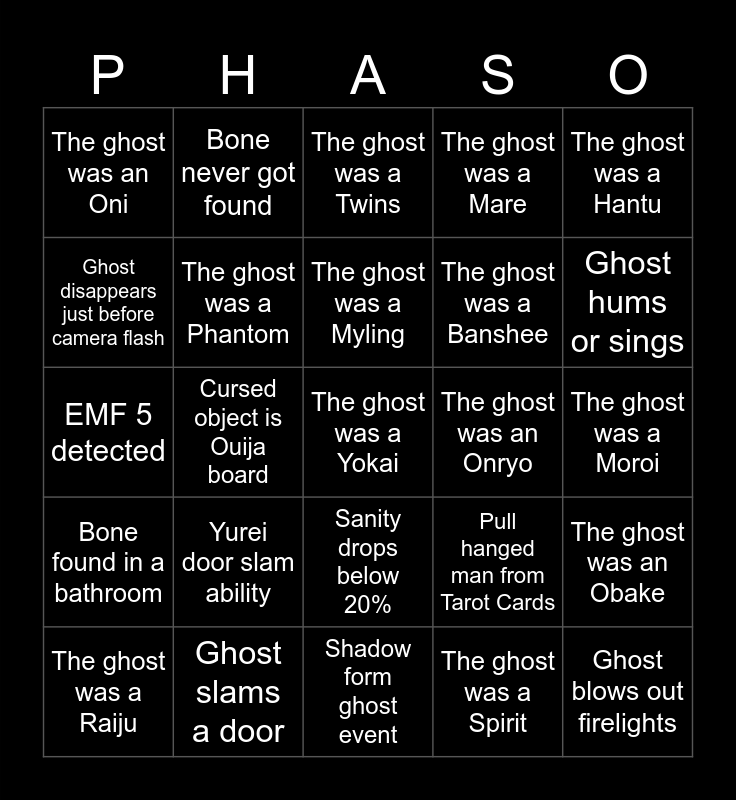 This bingo card has 58 words: Free!, Ghost slams a door, Wrong ghost identified, Bone found in a bathroom, The ghost was a Spirit, The ghost was a Wraith, The ghost was a Phantom, The ghost was a Poltergeist, The ghost was a Banshee, The ghost was a Jinn, The ghost was a Mare, The ghost was a Revenant, The ghost was a Shade, The ghost was a Demon, The ghost was a Yurei, The ghost was an Oni, The ghost was a Yokai, The ghost was a Hantu, The ghost was a Goryo, The ghost was a Myling, The ghost was an Onryo, The ghost was a Twins, The ghost was a Raiju, The ghost was an Obake, The ghost was a Mimic, The ghost was a Moroi, The ghost was a Deogen, The ghost was a Thaye, Ghost hums or sings, Fuse box is in the basement, Ghost interacts with a teddybear, Cursed object is Music box, Cursed object is Mirror, Cursed object is Tarot cards, Cursed object is Voodoo doll, Cursed object is Monkeys paw, Cursed object is Summoning circle, Cursed object is Ouija board, EMF 5 detected, Ghost laughs creepily, Yurei door slam ability, Ghost blows out firelights, Pull hanged man from Tarot Cards, Poltergeist ability, Hunting within 5 minutes of entering the house, All objectives completed, Ghost room in the garage, Sanity drops below 20%, Shadow form ghost event, Mistform ghost event, Ghost breaks lights in a room, Dirty water found, Ghost room changes, Bone is in the kitchen, Bone never got found, Ghost model is john pork, Ghost disappears just before camera flash and Lights get flickered.