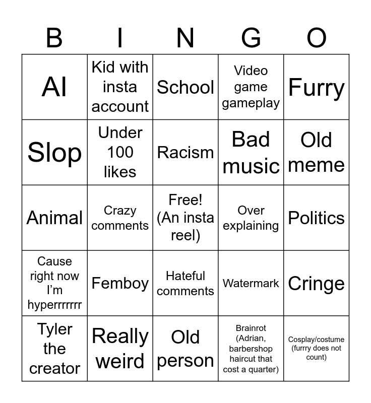 This bingo card has a free space and 24 words: Femboy, Really weird, Racism, Tyler the creator, Furry, AI, Slop, Kid with insta account, Over explaining, Hateful comments, Bad music, Animal, Watermark, Cringe, Under 100 likes, Brainrot (Adrian, barbershop haircut that cost a quarter), Politics, School, Old meme, Crazy comments, Cosplay/costume (furrry does not count), Cause right now I’m hyperrrrrrr, Video game gameplay and Old person.