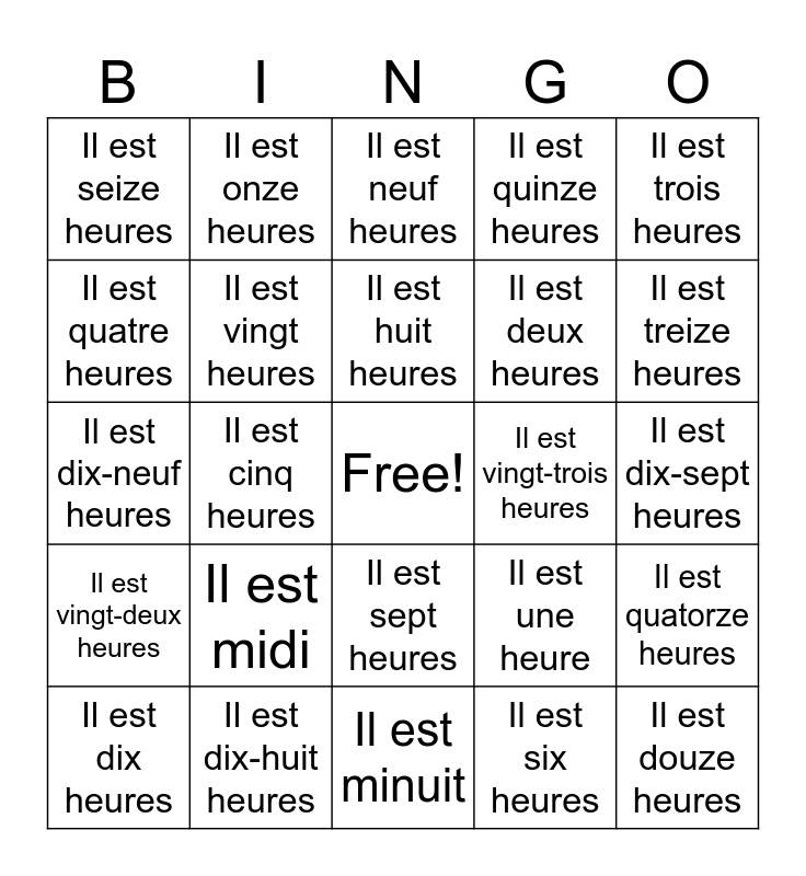 This bingo card has a free space and 24 words: Il est midi, Il est dix-huit heures, Il est huit heures, Il est dix heures, Il est trois heures, Il est seize heures, Il est quatre heures, Il est onze heures, Il est vingt-trois heures, Il est sept heures, Il est deux heures, Il est dix-neuf heures, Il est une heure, Il est quatorze heures, Il est vingt heures, Il est six heures, Il est dix-sept heures, Il est neuf heures, Il est treize heures, Il est cinq heures, Il est douze heures, Il est vingt-deux heures, Il est quinze heures and Il est minuit.