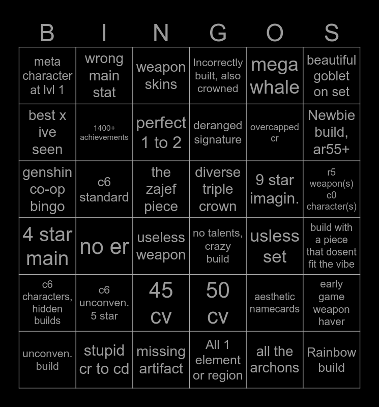 This bingo card has 36 words: 50 cv, 45 cv, All 1 element or region, best x ive seen, 4 star main, diverse triple crown, 1400+ achievements, missing artifact, mega whale, aesthetic namecards, Newbie build, ar55+, Incorrectly built, also crowned, early game weapon haver, c6 standard, deranged signature, meta character at lvl 1, c6 characters, hidden builds, 9 star imagin., genshin co-op bingo, weapon skins, the zajef piece, no er, no talents, crazy build, useless weapon, usless set, wrong main stat, overcapped cr, stupid cr to cd, perfect 1 to 2, beautiful goblet on set, Rainbow build, unconven. build, build with a piece that dosent fit the vibe, r5 weapon(s) c0 character(s), c6 unconven. 5 star and all the archons.