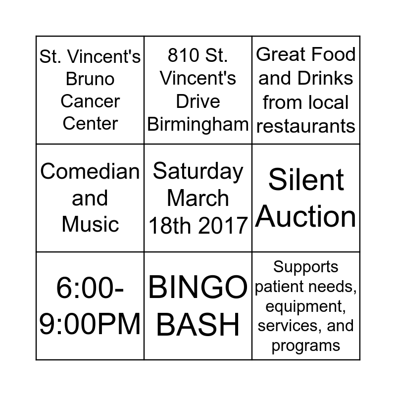 This bingo card has 9 words: 6:00-9:00PM, Great Food and Drinks from local restaurants, 810 St. Vincent's Drive Birmingham, Comedian and Music, St. Vincent's Bruno Cancer Center, Silent Auction, Saturday March 18th 2017, Supports patient needs, equipment, services, and programs and BINGO BASH.