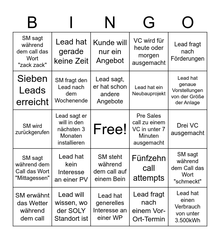 This bingo card has a free space and 24 words: Lead hat kein Interesse an einer PV, Lead will wissen, wo der SOLY Standort ist, Lead sagt, er hat schon andere Angebote, SM erwähnt das Wetter während dem call, Lead fragt nach Förderungen, SM sagt während dem call das Wort "zack zack", Sieben Leads erreicht, Lead hat gerade keine Zeit, Pre Sales call zu einem VC in unter 7 Minuten ausgemacht, SM steht während dem call auf einem Bein, Lead hat ein Neubauprojekt, SM wird zurückgerufen, Fünfzehn call attempts, SM sagt während dem Call das Wort "schmeckt", SM fragt den Lead nach dem Wochenende, Lead fragt nach einem Vor-Ort-Termin, Drei VC ausgemacht, Kunde will nur ein Angebot, Lead hat genaue Vorstellungen von der Größe der Anlage, Lead sagt er will in den nächsten 3 Monaten installieren, Lead hat einen Verbrauch von unter 3.500kWh, SM sagt während dem Call das Wort "Mittagessen", VC wird für heute oder morgen ausgemacht and Lead hat generelles Interesse an einer WP.