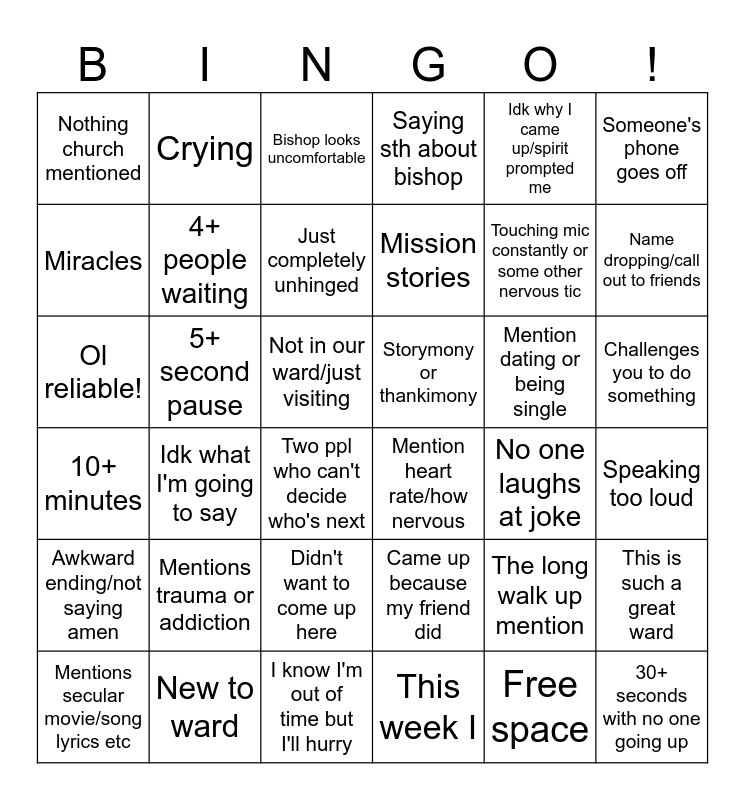 This bingo card has 36 words: Came up because my friend did, Didn't want to come up here, This week I, Miracles, 10+ minutes, Storymony or thankimony, 4+ people waiting, I know I'm out of time but I'll hurry, Idk why I came up/spirit prompted me, The long walk up mention, Name dropping/call out to friends, Saying sth about bishop, This is such a great ward, 5+ second pause, Mission stories, Nothing church mentioned, Awkward ending/not saying amen, Mention dating or being single, Ol reliable!, Bishop looks uncomfortable, Not in our ward/just visiting, Idk what I'm going to say, Mention heart rate/how nervous, Two ppl who can't decide who's next, No one laughs at joke, Crying, Touching mic constantly or some other nervous tic, New to ward, Just completely unhinged, Someone's phone goes off, 30+ seconds with no one going up, Mentions secular movie/song lyrics etc, Speaking too loud, Challenges you to do something, Mentions trauma or addiction and Free space.
