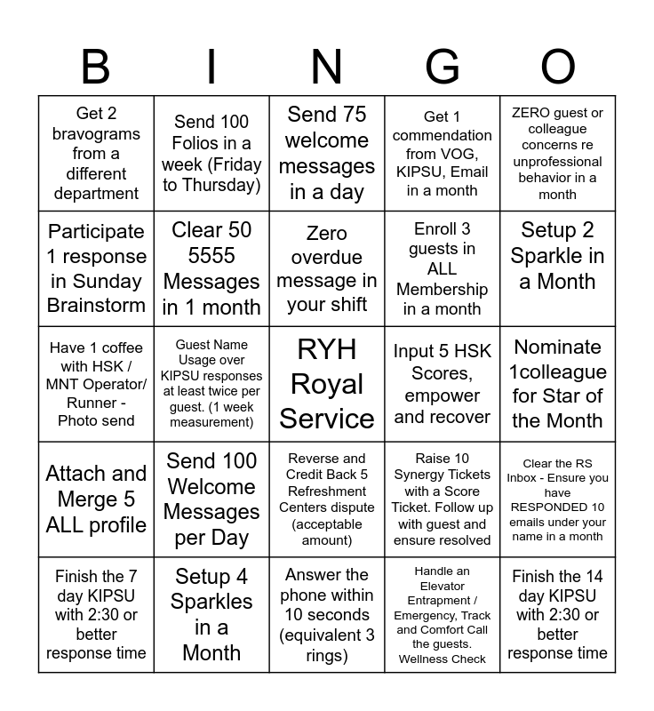 This bingo card has a free space and 24 words: Send 100 Welcome Messages per Day, Setup 4 Sparkles in a Month, Zero overdue message in your shift, Finish the 7 day KIPSU with 2:30 or better response time, ZERO guest or colleague concerns re unprofessional behavior in a month, Get 2 bravograms from a different department, Participate 1 response in Sunday Brainstorm, Send 100 Folios in a week (Friday to Thursday), Input 5 HSK Scores, empower and recover, Reverse and Credit Back 5 Refreshment Centers dispute (acceptable amount), Enroll 3 guests in ALL Membership in a month, Have 1 coffee with HSK / MNT Operator/ Runner - Photo send, Raise 10 Synergy Tickets with a Score Ticket. Follow up with guest and ensure resolved, Clear the RS Inbox - Ensure you have RESPONDED 10 emails under your name in a month, Clear 50 5555 Messages in 1 month, Handle an Elevator Entrapment / Emergency, Track and Comfort Call the guests. Wellness Check, Nominate 1colleague for Star of the Month, Send 75 welcome messages in a day, Setup 2 Sparkle in a Month, Guest Name Usage over KIPSU responses at least twice per guest. (1 week measurement), Finish the 14 day KIPSU with 2:30 or better response time, Attach and Merge 5 ALL profile, Get 1 commendation from VOG, KIPSU, Email in a month and Answer the phone within 10 seconds (equivalent 3 rings).
