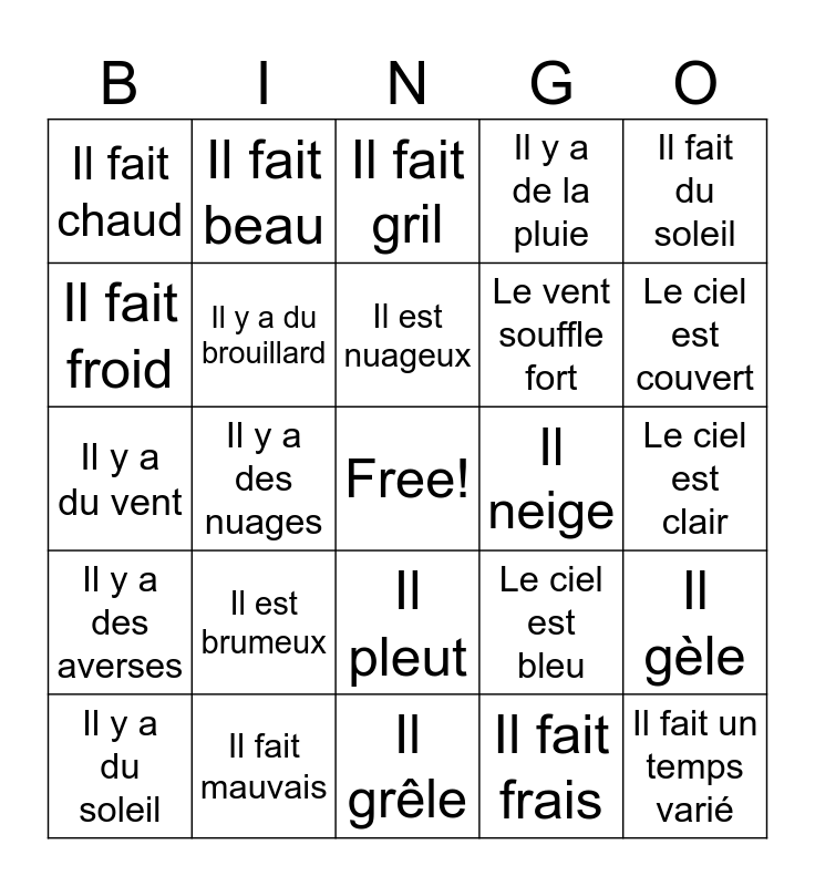 This bingo card has a free space and 24 words: Il est brumeux, Il fait mauvais, Il est nuageux, Il y a du soleil, Il fait du soleil, Il fait chaud, Il fait froid, Il fait beau, Il neige, Il pleut, Le vent souffle fort, Il y a du vent, Le ciel est bleu, Il gèle, Il y a du brouillard, Il fait frais, Le ciel est clair, Il fait gril, Le ciel est couvert, Il y a des nuages, Il fait un temps varié, Il y a des averses, Il y a de la pluie and Il grêle.