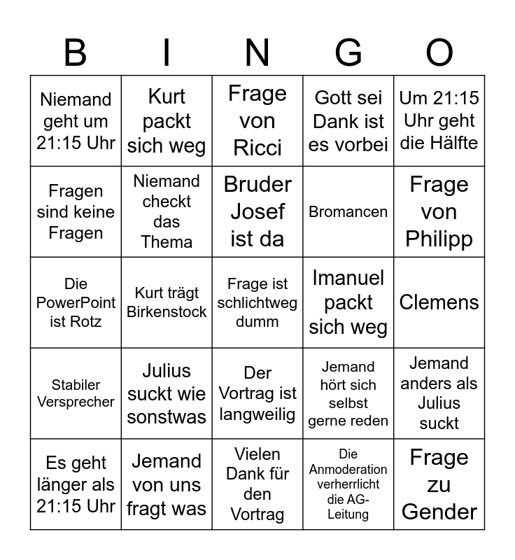 This bingo card has 25 words: Julius suckt wie sonstwas, Vielen Dank für den Vortrag, Bruder Josef ist da, Es geht länger als 21:15 Uhr, Um 21:15 Uhr geht die Hälfte, Niemand geht um 21:15 Uhr, Fragen sind keine Fragen, Kurt packt sich weg, Imanuel packt sich weg, Der Vortrag ist langweilig, Bromancen, Die PowerPoint ist Rotz, Jemand hört sich selbst gerne reden, Jemand anders als Julius suckt, Niemand checkt das Thema, Frage zu Gender, Clemens, Frage von Ricci, Frage von Philipp, Kurt trägt Birkenstock, Frage ist schlichtweg dumm, Jemand von uns fragt was, Stabiler Versprecher, Gott sei Dank ist es vorbei and Die Anmoderation verherrlicht die AG-Leitung.