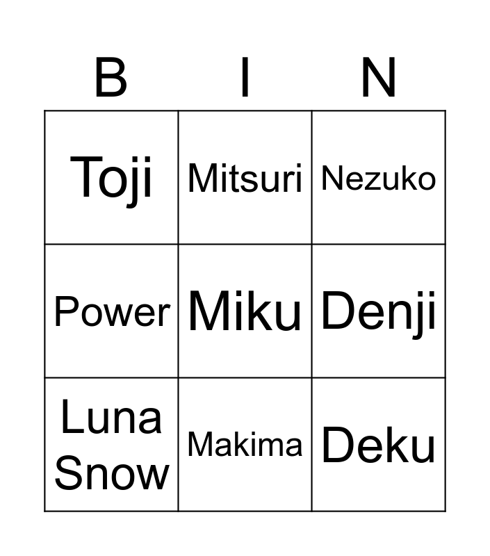 This bingo card has a free space and 8 words: Denji, Nezuko, Mitsuri, Luna Snow, Toji, Deku, Power and Makima.