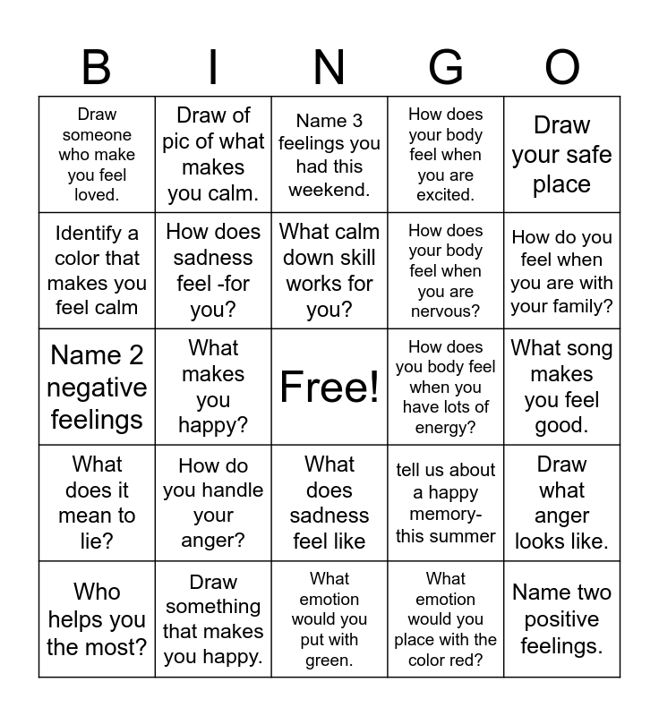 This bingo card has a free space and 24 words: How do you handle your anger?, Draw something that makes you happy., What calm down skill works for you?, Who helps you the most?, Draw your safe place, Draw someone who make you feel loved., Identify a color that makes you feel calm, Draw of pic of what makes you calm., How does you body feel when you have lots of energy?, What does sadness feel like, How does your body feel when you are nervous?, Name 2 negative feelings, tell us about a happy memory- this summer, Draw what anger looks like., How does sadness feel -for you?, What emotion would you place with the color red?, What song makes you feel good., Name 3 feelings you had this weekend., How do you feel when you are with your family?, What makes you happy?, Name two positive feelings., What does it mean to lie?, How does your body feel when you are excited. and What emotion would you put with green..