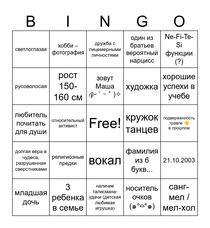 This bingo card has a free space and 24 words: религиозные предки, 3 ребенка в семье, зовут Маша ദ്ദി˶˃ ᵕ ˂ )✧, младшая дочь, Ne-Fi-Te-Si функции (?), светлоглазая, русоволосая, хобби – фотография, кружок танцев, вокал, художка, любитель почитать для души, фамилия из 6 букв..., 21.10.2003, рост 150-160 см, носитель очков (๑°⌓︎°๑), подверженность травле 🤏 в прошлом, дружба с лицемерными личностями, хорошие успехи в учебе, относительный активист, санг-мел / мел-хол, долгая вера в чудеса, разрушенная сверстниками, один из братьев вероятный нарцисс and наличие талисмана-удачи (детская любимая игрушка).
