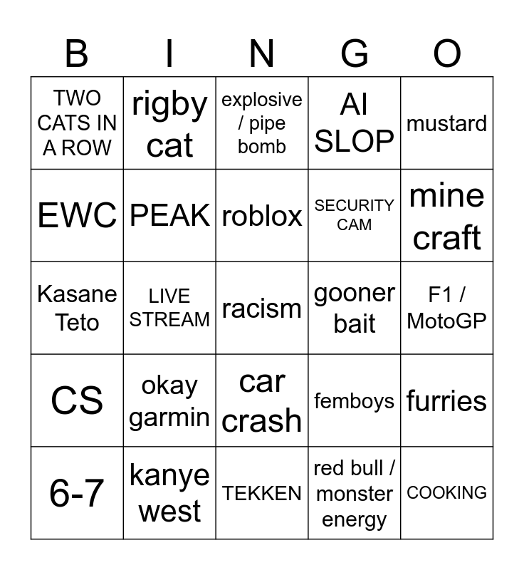 This bingo card has a free space and 24 words: okay garmin, kanye west, roblox, 6-7, mustard, TWO CATS IN A ROW, EWC, rigby cat, gooner bait, car crash, SECURITY CAM, Kasane Teto, femboys, furries, PEAK, red bull / monster energy, F1 / MotoGP, explosive / pipe bomb, mine craft, LIVE STREAM, COOKING, CS, AI SLOP and TEKKEN.