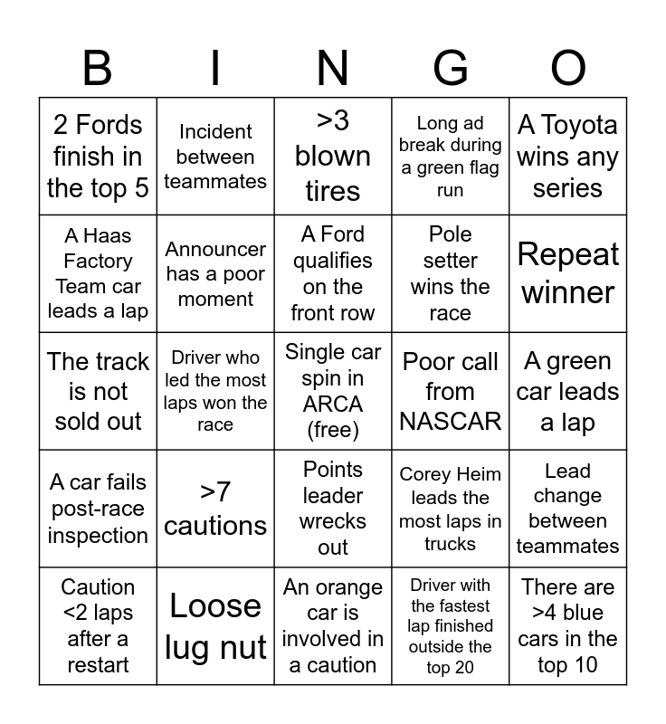 This bingo card has a free space and 24 words: Caution <2 laps after a restart, >7 cautions, A Ford qualifies on the front row, Driver with the fastest lap finished outside the top 20, A Toyota wins any series, 2 Fords finish in the top 5, Incident between teammates, >3 blown tires, Poor call from NASCAR, A green car leads a lap, The track is not sold out, Announcer has a poor moment, Corey Heim leads the most laps in trucks, Lead change between teammates, A Haas Factory Team car leads a lap, Loose lug nut, An orange car is involved in a caution, Long ad break during a green flag run, Repeat winner, A car fails post-race inspection, Driver who led the most laps won the race, Points leader wrecks out, Pole setter wins the race and There are >4 blue cars in the top 10.