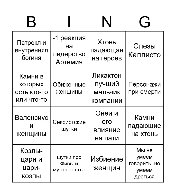 This bingo card has 16 words: шутки про Фивы и мужеложство, Камни падающие на хтонь, Хтонь падающая на героев, Патрокл и внутренняя богиня, Валенсиус и женщины, -1 реакция на лидерство Артемия, Эней и его влияние на пати, Избиение женщин, Камни в которых есть кто-то или что-то, Обиженные женщины, Козлы-цари и цари-козлы, Слезы Каллисто, Сексистские шутки, Персонажи при смерти, Ликактон лучший мальчик компании and Мы не умеем говорить, но умеем драться.
