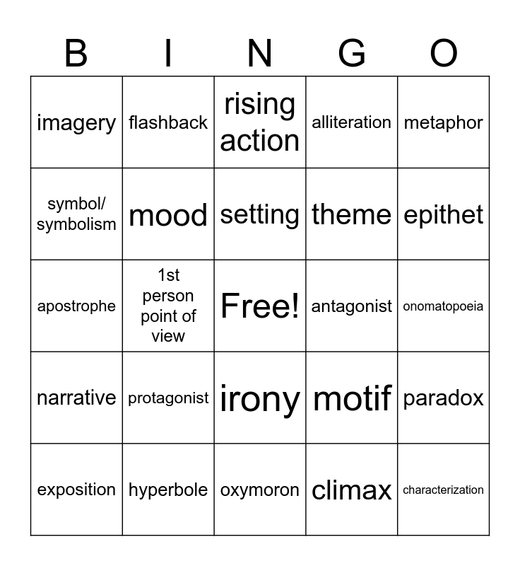This bingo card has a free space and 44 words: plot, characterization, simile, exposition, resolution, climax, rising action, falling action, metaphor, hyperbole, alliteration, antagonist, irony, protagonist, conflict, oxymoron, dramatic irony, apostrophe, epiphany, epithet, flashback, foreshadowing, hyperbole, imagery, juxtaposition, onomatopoeia, idiom, narrator, motif, narrative, oxymoron, paradox, personification, 3rd person point of view, 1st person point of view, 3rd person limited point of view, 3rd person omniscient point of view, satire, setting, symbol/ symbolism, theme, tone, mood and understatement.
