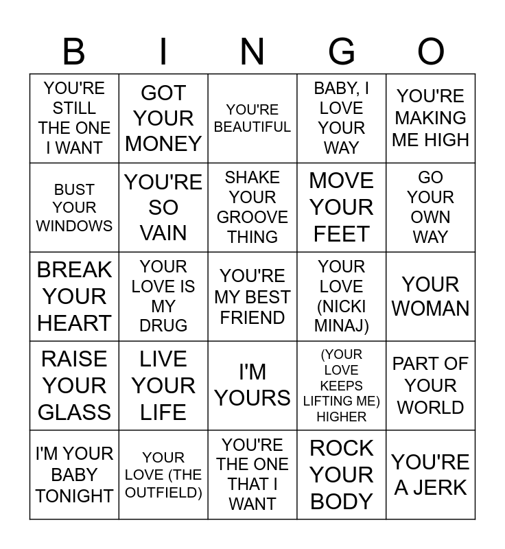 This bingo card has 30 words: YOUR LOVE (THE OUTFIELD), YOUR SONG, YOUR LOVE IS MY DRUG, YOUR MAN, YOU'RE STILL THE ONE I WANT, YOU'RE BEAUTIFUL, YOU'RE SO VAIN, I'M YOURS, YOUR LOVE (NICKI MINAJ), YOU'RE THE ONE THAT I WANT, YOUR WOMAN, YOU'RE MY BEST FRIEND, ROCK YOUR BODY, YOU'RE A JERK, GO YOUR OWN WAY, YOUR BODY, (YOUR LOVE KEEPS LIFTING ME) HIGHER, RAISE YOUR GLASS, LIVE YOUR LIFE, YOU'RE MAKING ME HIGH, BREAK YOUR HEART, KEEP YOUR HANDS TO YOURSELF, GOT YOUR MONEY, MOVE YOUR FEET, BUST YOUR WINDOWS, BABY, I LOVE YOUR WAY, PART OF YOUR WORLD, I'M YOUR BABY TONIGHT, SHAKE YOUR GROOVE THING and LISTEN TO YOUR HEART.
