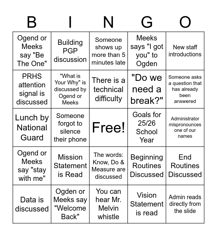 This bingo card has a free space and 24 words: Mission Statement is Read, Ogden or Meeks say "Welcome Back", There is a technical difficulty, Data is discussed, New staff introductions, Ogend or Meeks say "Be The One", PRHS attention signal is discussed, Building PGP discussion, Goals for 25/26 School Year, The words: Know, Do & Measure are discussed, "Do we need a break?", Lunch by National Guard, Beginning Routines Discussed, End Routines Discussed, "What is Your Why" is discussed by Ogend or Meeks, Vision Statement is read, Administrator mispronounces one of our names, Someone shows up more than 5 minutes late, Someone asks a question that has already been answered, Someone forgot to silence their phone, Admin reads directly from the slide, Ogend or Meeks say "stay with me", Meeks says "I got you" to Ogden and You can hear Mr. Melvin whistle.