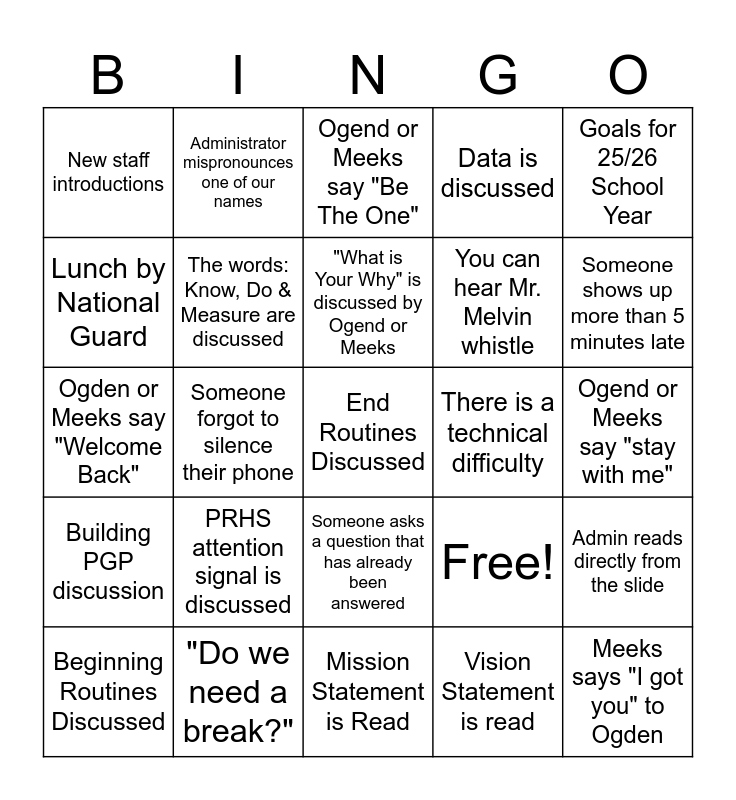 This bingo card has 25 words: PRHS attention signal is discussed, Mission Statement is Read, "What is Your Why" is discussed by Ogend or Meeks, Beginning Routines Discussed, Goals for 25/26 School Year, New staff introductions, Lunch by National Guard, Administrator mispronounces one of our names, There is a technical difficulty, Someone asks a question that has already been answered, You can hear Mr. Melvin whistle, Ogden or Meeks say "Welcome Back", Free!, Admin reads directly from the slide, The words: Know, Do & Measure are discussed, Meeks says "I got you" to Ogden, Ogend or Meeks say "stay with me", Ogend or Meeks say "Be The One", Someone shows up more than 5 minutes late, Someone forgot to silence their phone, End Routines Discussed, "Do we need a break?", Building PGP discussion, Data is discussed and Vision Statement is read.