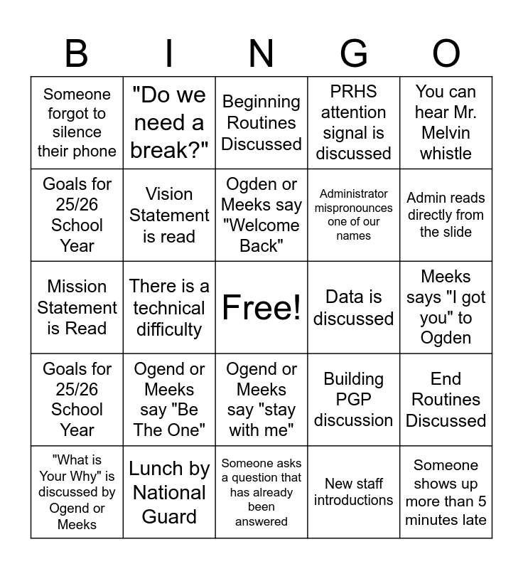 This bingo card has a free space and 24 words: Ogend or Meeks say "Be The One", Lunch by National Guard, Ogden or Meeks say "Welcome Back", "What is Your Why" is discussed by Ogend or Meeks, You can hear Mr. Melvin whistle, Someone forgot to silence their phone, Goals for 25/26 School Year, "Do we need a break?", Data is discussed, Ogend or Meeks say "stay with me", Administrator mispronounces one of our names, Mission Statement is Read, Building PGP discussion, End Routines Discussed, Vision Statement is read, New staff introductions, Meeks says "I got you" to Ogden, Beginning Routines Discussed, Admin reads directly from the slide, There is a technical difficulty, Someone shows up more than 5 minutes late, Goals for 25/26 School Year, PRHS attention signal is discussed and Someone asks a question that has already been answered.