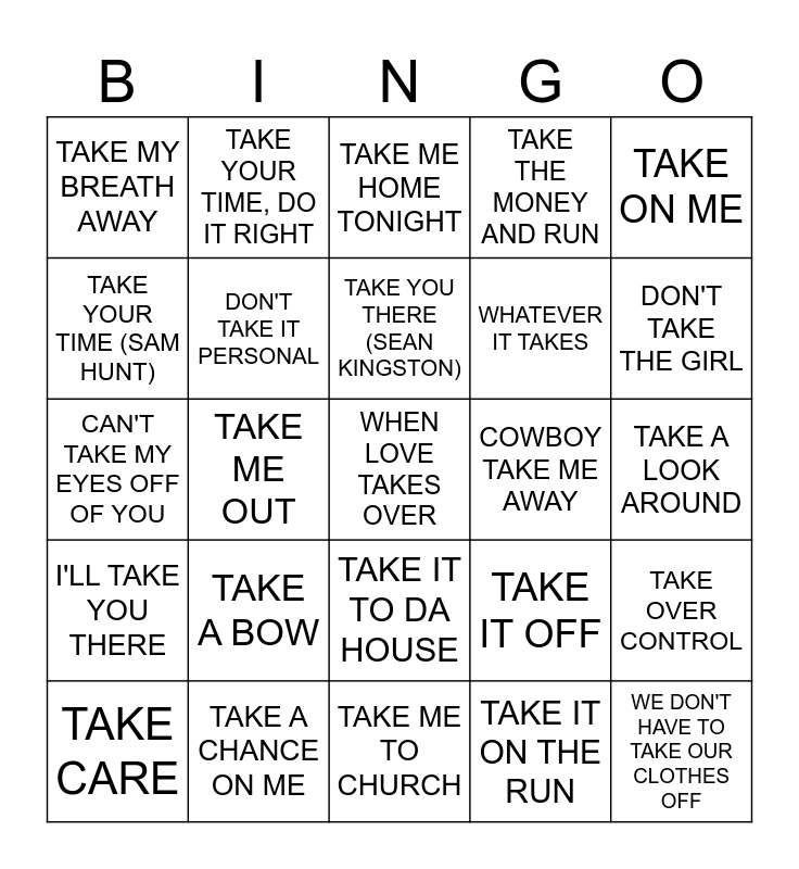 This bingo card has 25 words: TAKE A BOW, TAKE ME TO CHURCH, TAKE YOU THERE (SEAN KINGSTON), TAKE CARE, TAKE ON ME, TAKE MY BREATH AWAY, TAKE YOUR TIME (SAM HUNT), TAKE YOUR TIME, DO IT RIGHT, COWBOY TAKE ME AWAY, TAKE IT TO DA HOUSE, WHATEVER IT TAKES, CAN'T TAKE MY EYES OFF OF YOU, TAKE IT OFF, TAKE OVER CONTROL, DON'T TAKE IT PERSONAL, WE DON'T HAVE TO TAKE OUR CLOTHES OFF, TAKE A LOOK AROUND, TAKE ME HOME TONIGHT, DON'T TAKE THE GIRL, TAKE ME OUT, WHEN LOVE TAKES OVER, TAKE A CHANCE ON ME, I'LL TAKE YOU THERE, TAKE THE MONEY AND RUN and TAKE IT ON THE RUN.