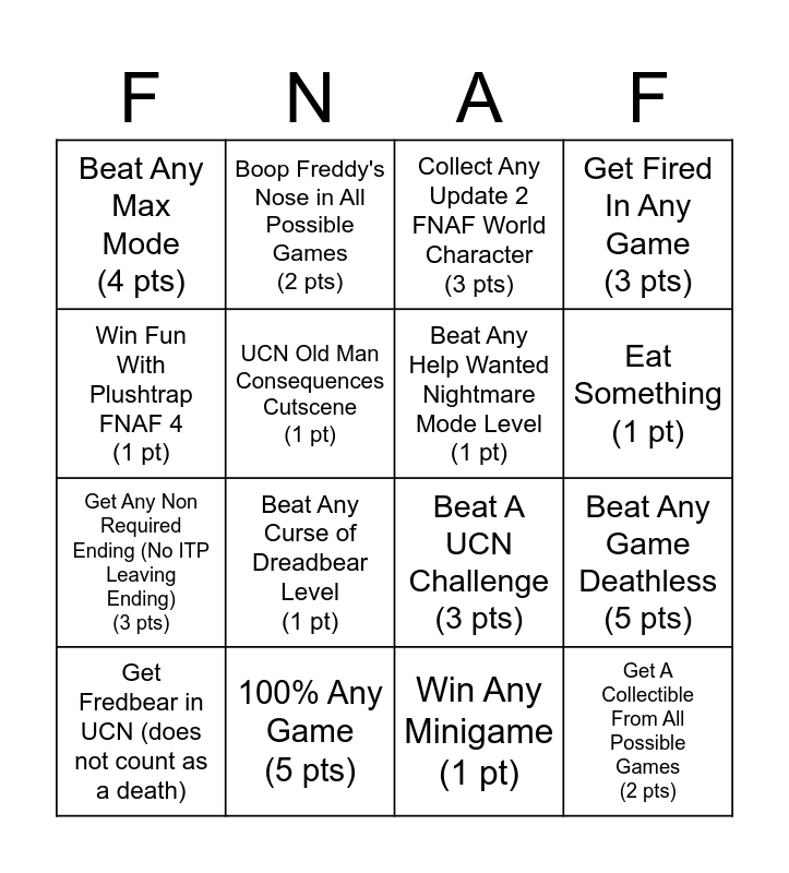 This bingo card has 16 words: 100% Any Game (5 pts), Beat Any Game Deathless (5 pts), Collect Any Update 2 FNAF World Character (3 pts), Beat Any Max Mode (4 pts), Get Any Non Required Ending (No ITP Leaving Ending) (3 pts), Boop Freddy's Nose in All Possible Games (2 pts), Beat A UCN Challenge (3 pts), Win Any Minigame (1 pt), Win Fun With Plushtrap FNAF 4 (1 pt), UCN Old Man Consequences Cutscene (1 pt), Get Fredbear in UCN (does not count as a death), Get Fired In Any Game (3 pts), Beat Any Curse of Dreadbear Level (1 pt), Eat Something (1 pt), Beat Any Help Wanted Nightmare Mode Level (1 pt) and Get A Collectible From All Possible Games (2 pts).