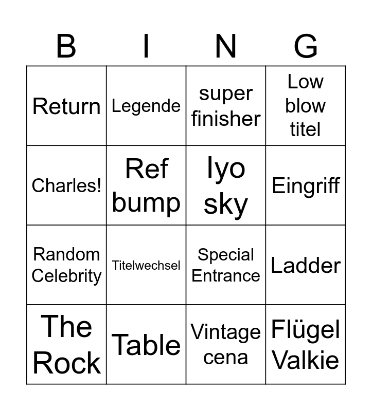 This bingo card has 16 words: Table, Ladder, super finisher, Return, Random Celebrity, Legende, Special Entrance, Vintage cena, Charles!, Ref bump, The Rock, Low blow titel, Titelwechsel, Eingriff, Iyo sky and Flügel Valkie.