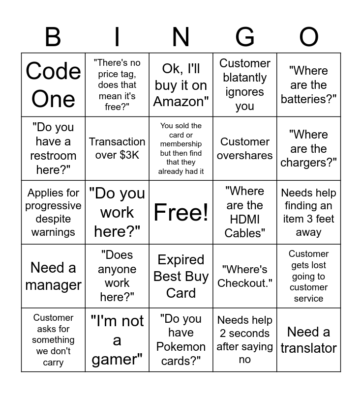 This bingo card has a free space and 24 words: "Does anyone work here?", "I'm not a gamer", You sold the card or membership but then find that they already had it, Customer asks for something we don't carry, "Where are the batteries?", Code One, "Do you have a restroom here?", "There's no price tag, does that mean it's free?", "Where are the HDMI Cables", Expired Best Buy Card, Customer overshares, Applies for progressive despite warnings, "Where's Checkout.", Customer gets lost going to customer service, Transaction over $3K, Needs help 2 seconds after saying no, Needs help finding an item 3 feet away, Ok, I'll buy it on Amazon", "Where are the chargers?", "Do you work here?", Need a translator, Need a manager, Customer blatantly ignores you and "Do you have Pokemon cards?".