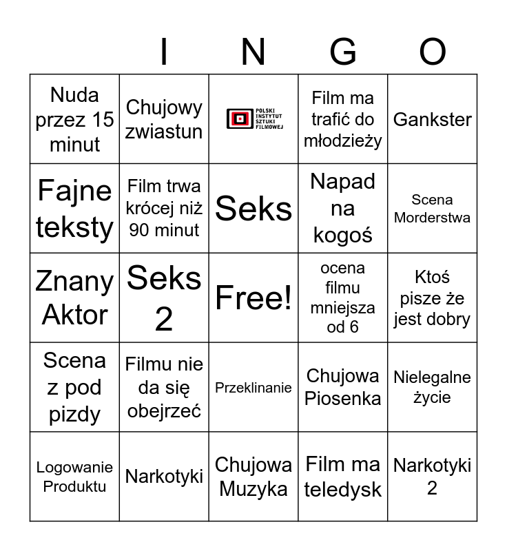 This bingo card has 1 images, a free space and 23 words: Filmu nie da się obejrzeć, Narkotyki, Seks, Logowanie Produktu, Gankster, Nuda przez 15 minut, Fajne teksty, Chujowy zwiastun, ocena filmu mniejsza od 6, Przeklinanie, Napad na kogoś, Znany Aktor, Chujowa Piosenka, Nielegalne życie, Film trwa krócej niż 90 minut, Film ma teledysk, Ktoś pisze że jest dobry, Scena Morderstwa, Seks 2, Narkotyki 2, Scena z pod pizdy, Film ma trafić do młodzieży and Chujowa Muzyka.