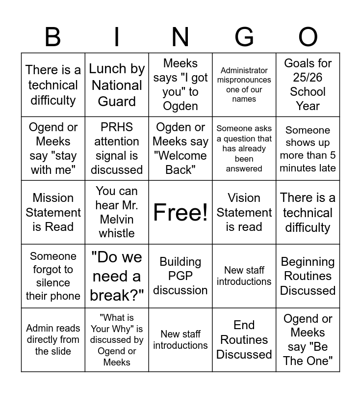 This bingo card has a free space and 24 words: "Do we need a break?", "What is Your Why" is discussed by Ogend or Meeks, Ogden or Meeks say "Welcome Back", Admin reads directly from the slide, Goals for 25/26 School Year, There is a technical difficulty, Ogend or Meeks say "stay with me", Lunch by National Guard, Vision Statement is read, Building PGP discussion, Someone asks a question that has already been answered, Mission Statement is Read, New staff introductions, Beginning Routines Discussed, PRHS attention signal is discussed, End Routines Discussed, There is a technical difficulty, Meeks says "I got you" to Ogden, Someone shows up more than 5 minutes late, You can hear Mr. Melvin whistle, Ogend or Meeks say "Be The One", Someone forgot to silence their phone, Administrator mispronounces one of our names and New staff introductions.