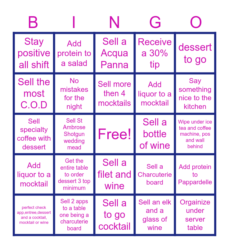 This bingo card has a free space and 24 words: Get the entire table to order dessert 3 top minimum, Sell 2 apps to a table one being a charcuterie board, Sell more then 4 mocktails, perfect check app,entree,dessert and a cocktail, mocktail or wine, dessert to go, Stay positive all shift, Sell the most C.O.D, Add protein to a salad, Sell a bottle of wine, Sell a filet and wine, Add liquor to a mocktail, Sell specialty coffee with dessert, Sell a Charcuterie board, Add protein to Pappardelle, No mistakes for the night, Sell an elk and a glass of wine, Wipe under ice tea and coffee machine, pos and wall behind, Sell a Acqua Panna, Say something nice to the kitchen, Sell St Ambrose Shotgun wedding mead, Orgainize under server table, Add liquor to a mocktail, Receive a 30% tip and Sell a to go cocktail.