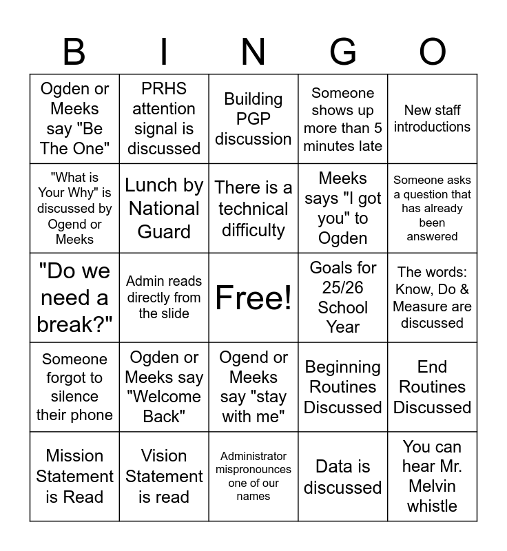 This bingo card has a free space and 24 words: Mission Statement is Read, Ogden or Meeks say "Welcome Back", There is a technical difficulty, Data is discussed, New staff introductions, Ogden or Meeks say "Be The One", PRHS attention signal is discussed, Building PGP discussion, Goals for 25/26 School Year, The words: Know, Do & Measure are discussed, "Do we need a break?", Lunch by National Guard, Beginning Routines Discussed, End Routines Discussed, "What is Your Why" is discussed by Ogend or Meeks, Vision Statement is read, Administrator mispronounces one of our names, Someone shows up more than 5 minutes late, Someone asks a question that has already been answered, Someone forgot to silence their phone, Admin reads directly from the slide, Ogend or Meeks say "stay with me", Meeks says "I got you" to Ogden and You can hear Mr. Melvin whistle.