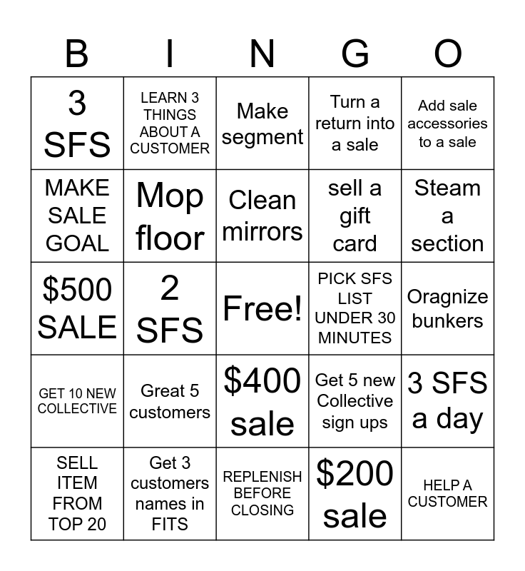 This bingo card has a free space and 24 words: Great 5 customers, Get 3 customers names in FITS, Clean mirrors, SELL ITEM FROM TOP 20, Add sale accessories to a sale, 3 SFS, MAKE SALE GOAL, LEARN 3 THINGS ABOUT A CUSTOMER, PICK SFS LIST UNDER 30 MINUTES, $400 sale, sell a gift card, $500 SALE, Get 5 new Collective sign ups, 3 SFS a day, Mop floor, $200 sale, Oragnize bunkers, Make segment, Steam a section, 2 SFS, HELP A CUSTOMER, GET 10 NEW COLLECTIVE, Turn a return into a sale and REPLENISH BEFORE CLOSING.