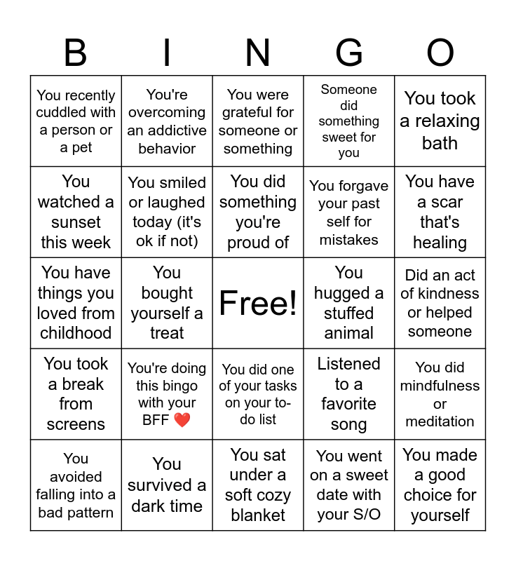 This bingo card has a free space and 24 words: You're doing this bingo with your BFF ❤️, You survived a dark time, You did something you're proud of, You avoided falling into a bad pattern, You took a relaxing bath, You recently cuddled with a person or a pet, You watched a sunset this week, You're overcoming an addictive behavior, You hugged a stuffed animal, You did one of your tasks on your to-do list, You forgave your past self for mistakes, You have things you loved from childhood, Listened to a favorite song, You did mindfulness or meditation, You smiled or laughed today (it's ok if not), You went on a sweet date with your S/O, Did an act of kindness or helped someone, You were grateful for someone or something, You have a scar that's healing, You bought yourself a treat, You made a good choice for yourself, You took a break from screens, Someone did something sweet for you and You sat under a soft cozy blanket.