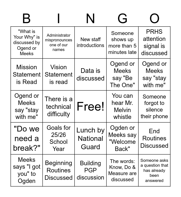 This bingo card has a free space and 24 words: Goals for 25/26 School Year, Beginning Routines Discussed, Data is discussed, Meeks says "I got you" to Ogden, PRHS attention signal is discussed, "What is Your Why" is discussed by Ogend or Meeks, Mission Statement is Read, Administrator mispronounces one of our names, You can hear Mr. Melvin whistle, Lunch by National Guard, Ogend or Meeks say "Be The One", Ogend or Meeks say "stay with me", Ogden or Meeks say "Welcome Back", End Routines Discussed, Vision Statement is read, The words: Know, Do & Measure are discussed, Someone forgot to silence their phone, New staff introductions, Ogend or Meeks say "stay with me", There is a technical difficulty, Someone asks a question that has already been answered, "Do we need a break?", Someone shows up more than 5 minutes late and Building PGP discussion.