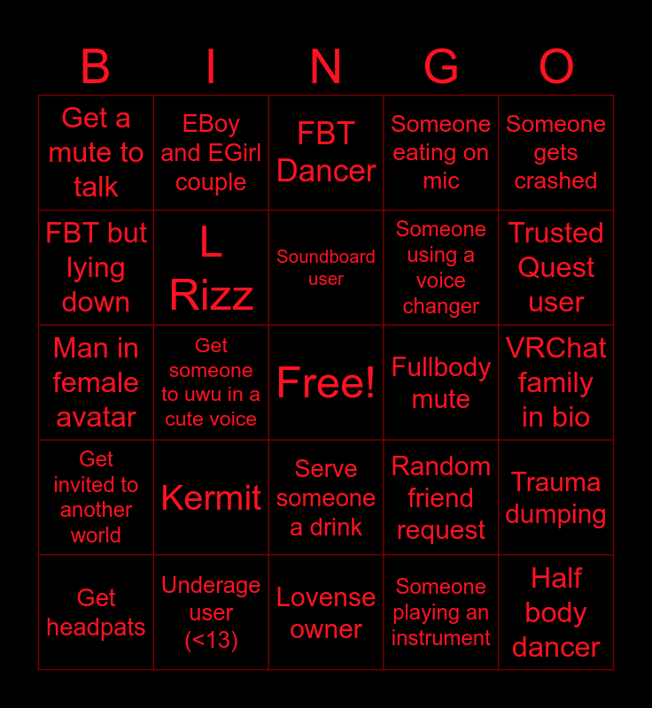 This bingo card has a free space and 24 words: Kermit, Underage user (<13), Soundboard user, Get headpats, Someone gets crashed, Get a mute to talk, FBT but lying down, EBoy and EGirl couple, Fullbody mute, Serve someone a drink, Someone using a voice changer, Man in female avatar, Random friend request, Trauma dumping, L Rizz, Someone playing an instrument, VRChat family in bio, FBT Dancer, Trusted Quest user, Get someone to uwu in a cute voice, Half body dancer, Get invited to another world, Someone eating on mic and Lovense owner.