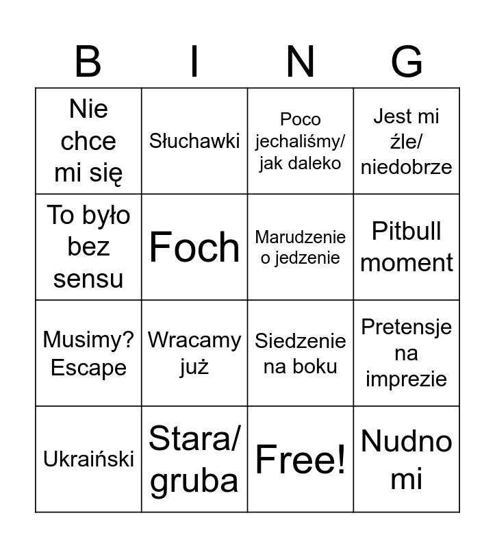 This bingo card has 16 words: Stara/ gruba, Pretensje na imprezie, Poco jechaliśmy/ jak daleko, Nie chce mi się, Musimy? Escape, Słuchawki, Siedzenie na boku, Free!, To było bez sensu, Foch, Ukraiński, Jest mi źle/ niedobrze, Wracamy już, Pitbull moment, Marudzenie o jedzenie and Nudno mi.